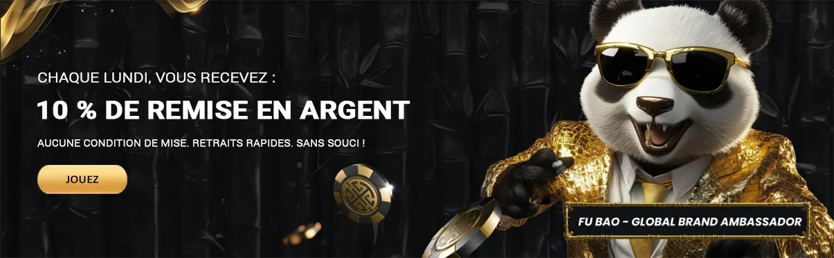 Chez Golden Panda Casino, nous savons que chaque semaine apporte son lot d’opportunités, et parfois de nouveaux défis. C’est pourquoi nous avons créé l’une des promotions les plus généreuses et transparentes du marché : notre bonus de cashback hebdomadaire de 10 % . Grâce à ce cashback unique, nous vous remboursons 10 % de vos pertes nettes en argent réel, sans aucune condition de mise. Vous pouvez ainsi jouer en toute liberté, tout en ayant l’assurance que nous sommes toujours là pour vous.